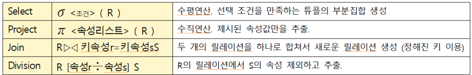 연산(데이터베이스에 저장된 실제 데이터를 처리하는 작업에 대한 명세로서 데이터베이스를 조작하는 기본 도구)