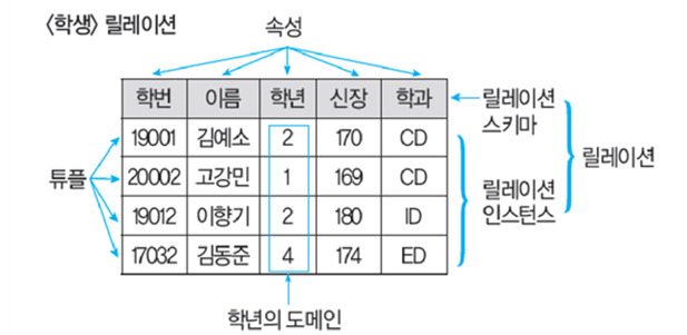 관계 : 개체 간의 관계 또는 속성 간의 논리적인 연결을 의미
