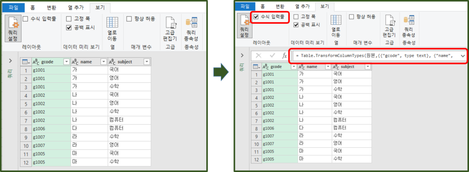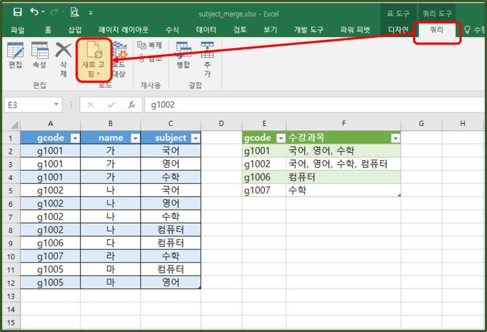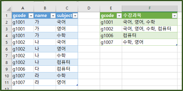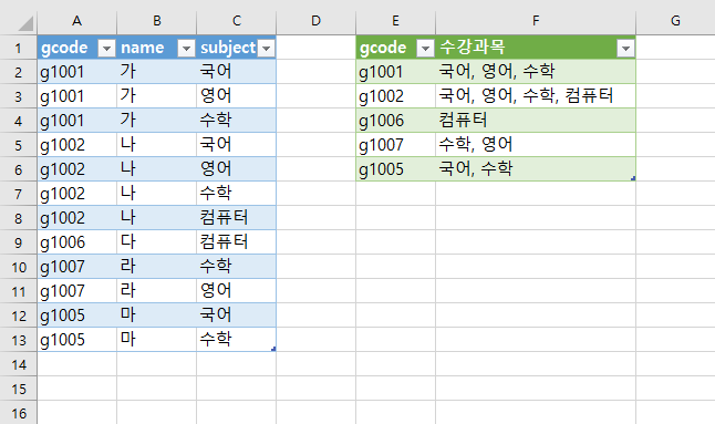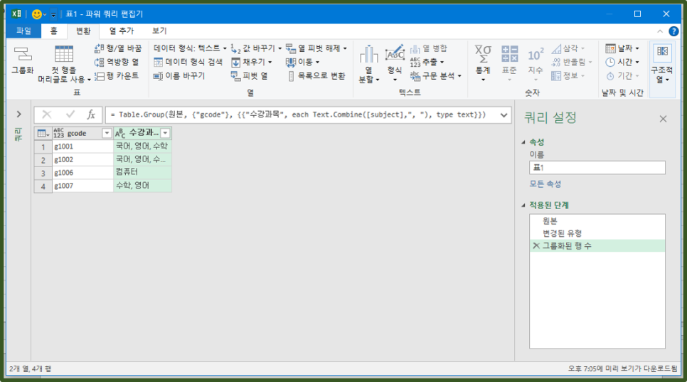 = Table.Group(원본, {"gcode"}, {{"수강과목", each Text.Combine([subject],", "), type text}})