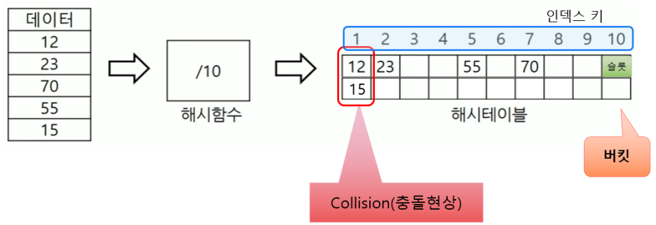 . Collision(충돌현상) : 서로 다른 두 개 이상의 레코드가 같은 주소를 갖는 현상