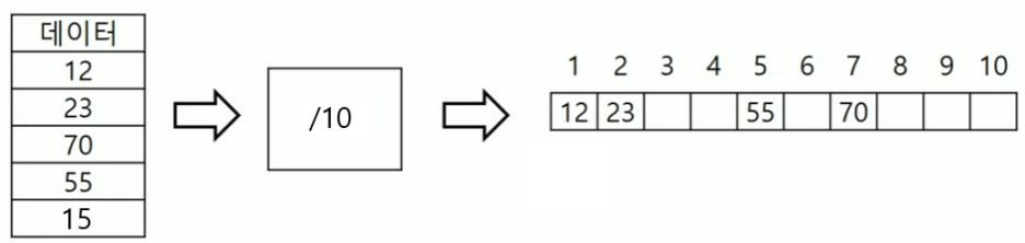 해싱 : 해시테이블에 해시함수를 이용하여 자료의 저장과 검색을 수행하는 방식